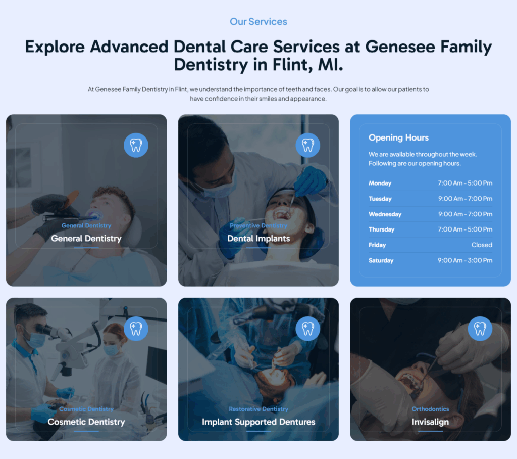 Structured for SEO → headings like “Explore Advanced Dental Care Services at Genesee Family Dentistry in Flint, MI.”