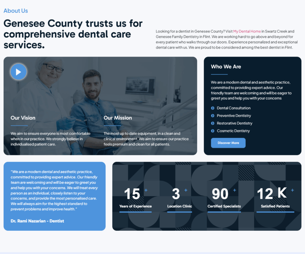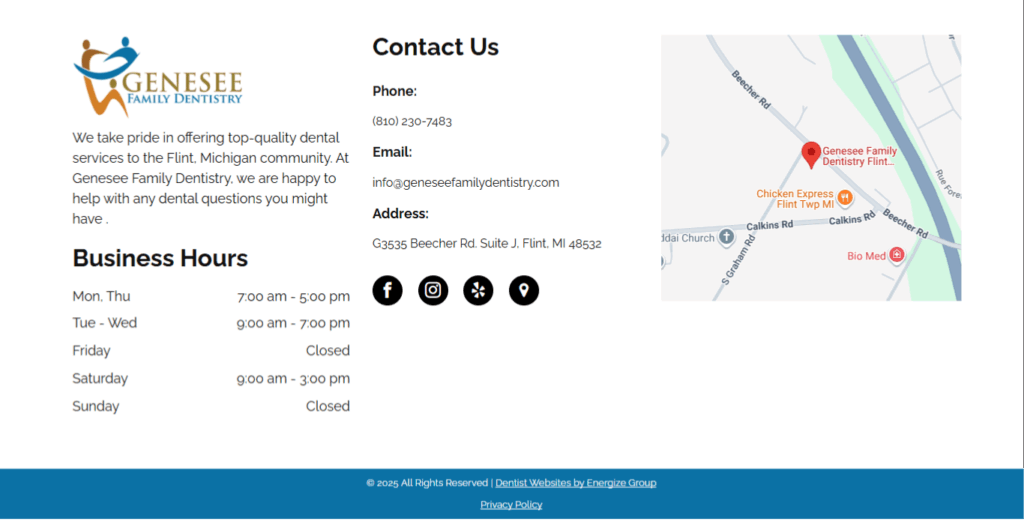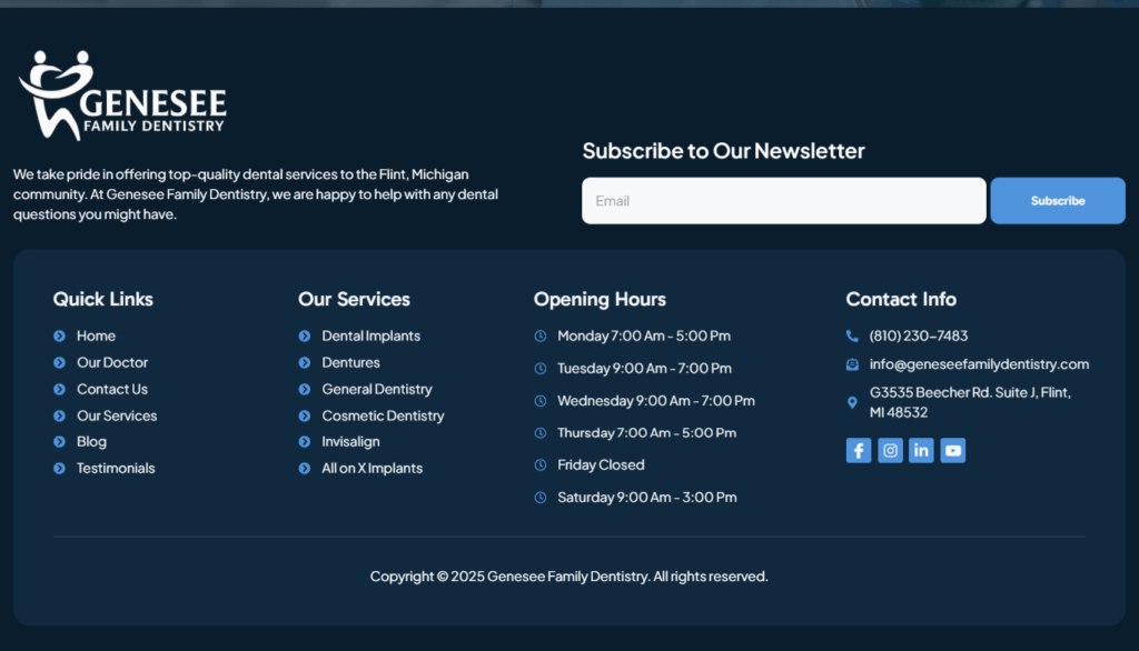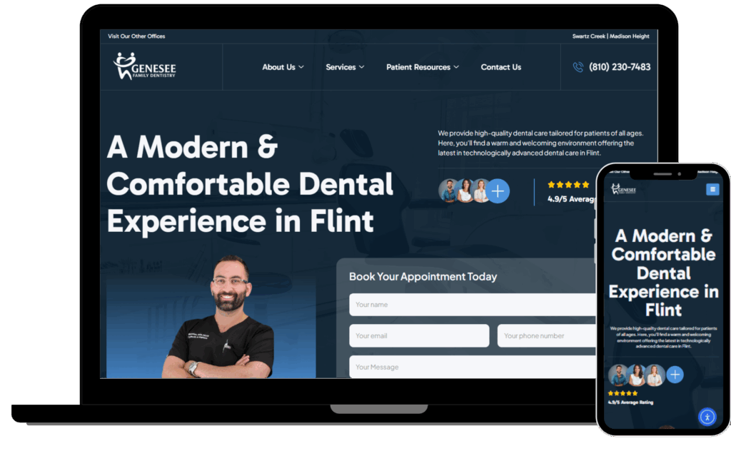 Genesee Family Dentistry’s old website was built on Duda. While it served its purpose, it lacked modern design, SEO optimization, and strong calls to action. Patients had limited engagement opportunities, and the site didn’t reflect the cutting-edge dental care the clinic provides.