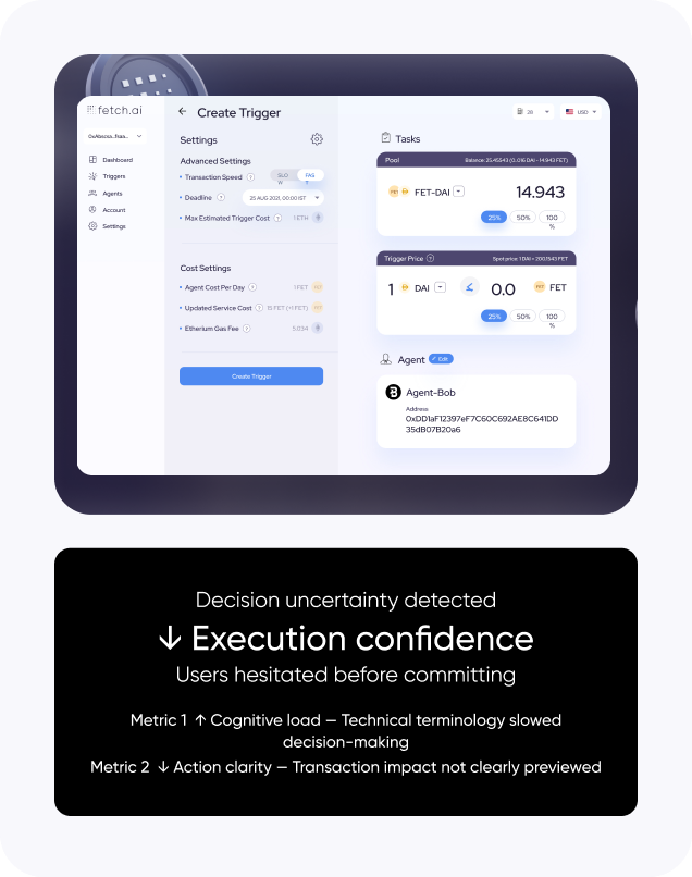 Despite strong functionality, users hesitated during automation setup and transaction confirmation.