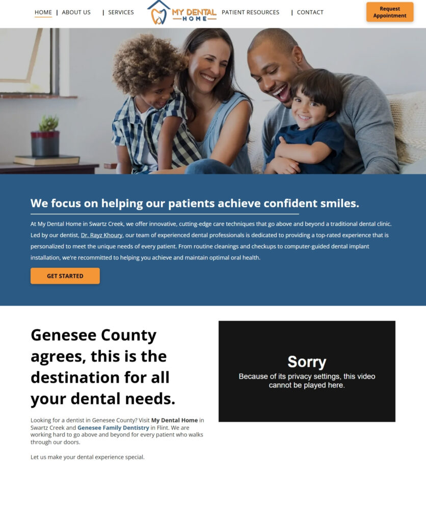 After: Keyword-rich headings (H1, H2) and service-specific content targeting search terms like Dental Implants Swartz Creek, Family Dentistry, Cosmetic Dentistry.